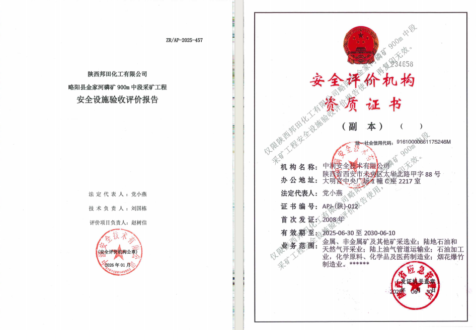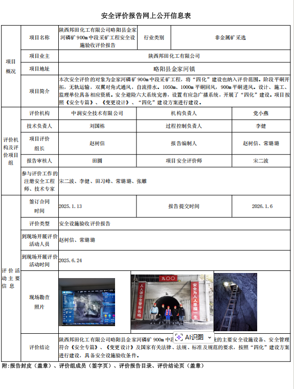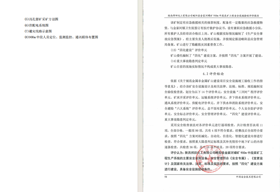 陜西邦田化工有限公司略陽縣金家河磷礦900m中段采礦工程安全設(shè)施驗收評價報告